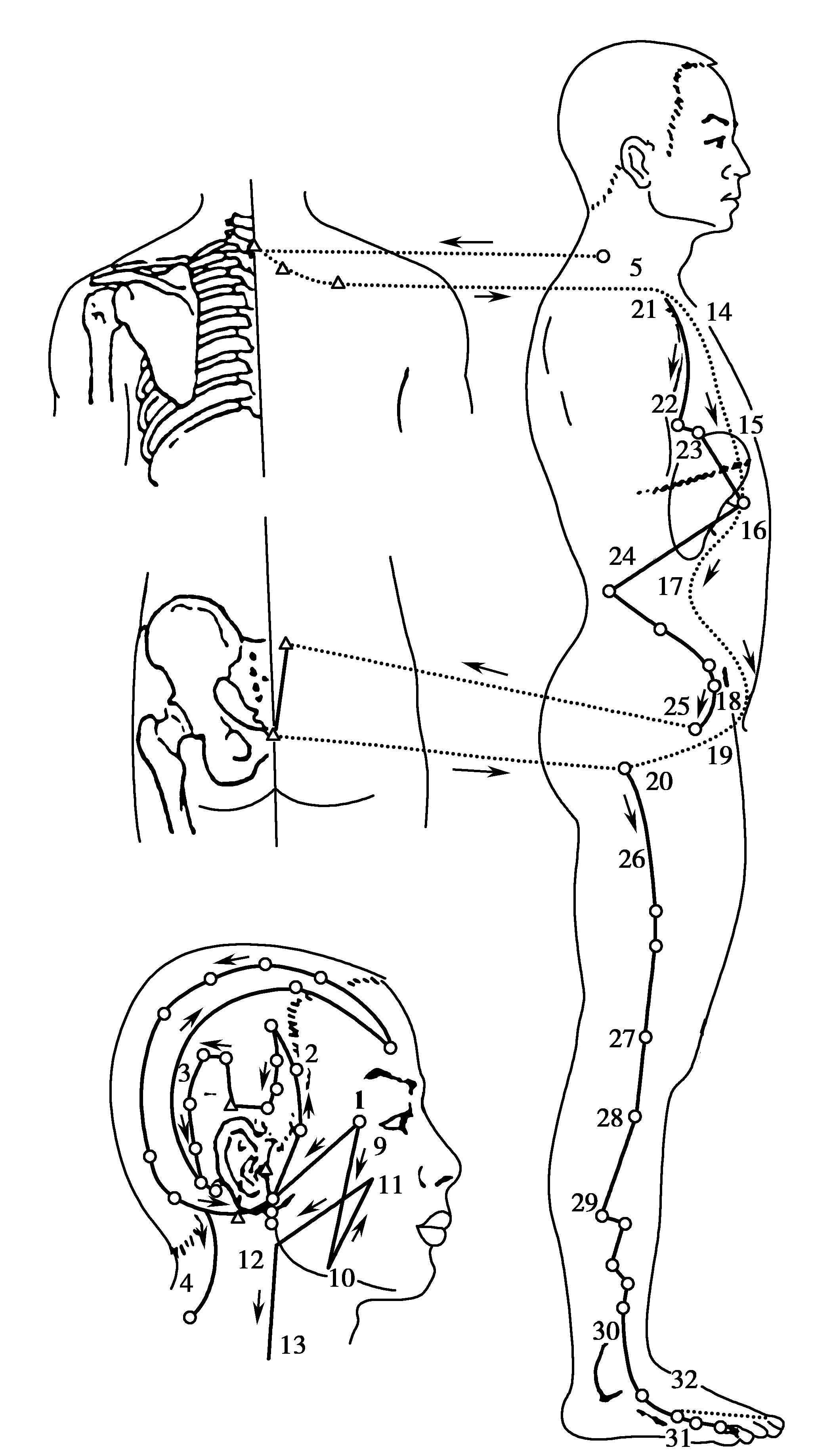 瞳子髎、听会、上关、颔厌、悬颅、悬厘、曲鬓、率谷、天冲、浮白、头窍阴、完骨、本神、阳白、头临泣、目窗、正营、承灵、脑空、风池、肩井、渊腋、辄筋、日月、京门、带脉、五枢、维道、居髎、环跳、风市、中渎、膝阳关、阳陵泉、阳交、外丘、光明、阳辅、悬钟、丘墟、足临泣、地五会、侠溪、足窍阴