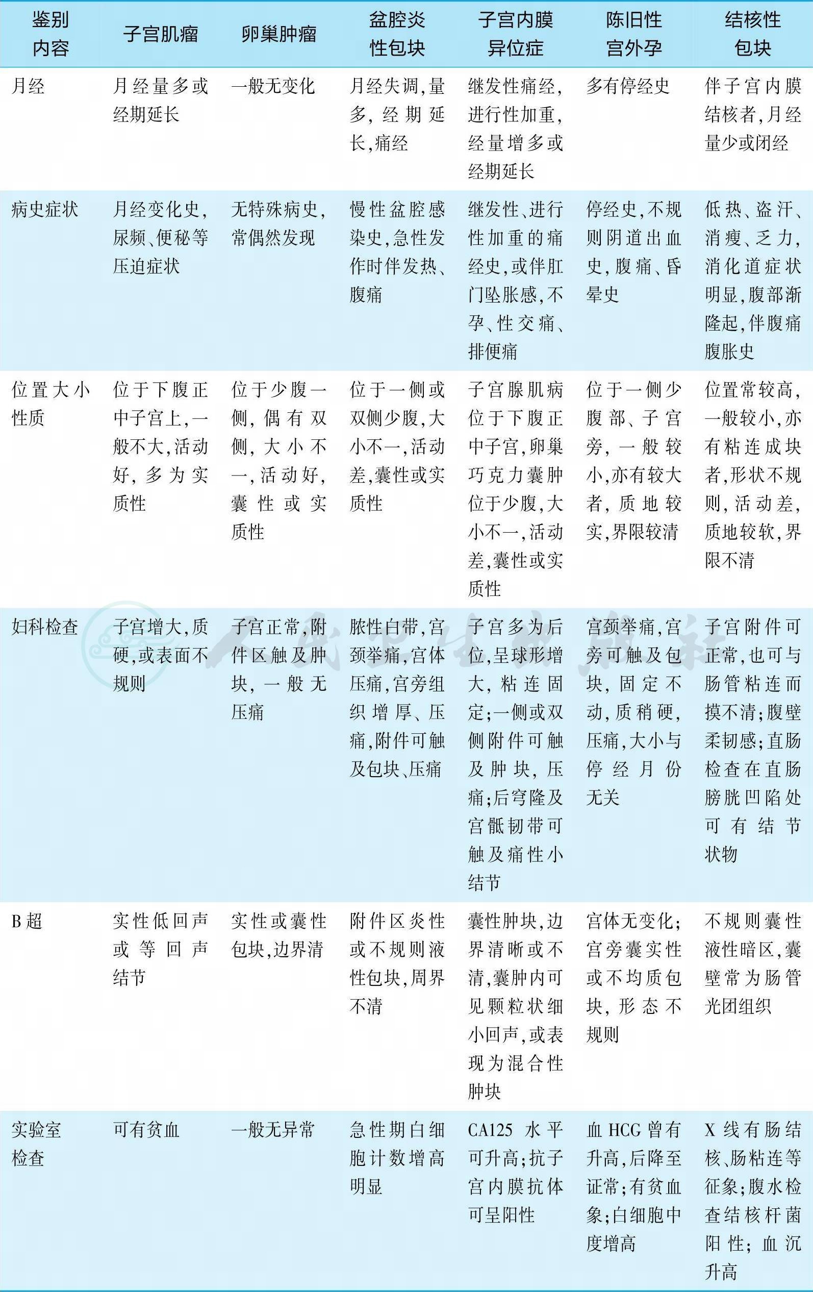 (2)辅助检查:B超、CT、MRI等影像学检查,检测肿块的形态、大小、部位、性状,有助于鉴别肿块性质;血清肿瘤标志物检查,有助于诊断卵巢恶性肿瘤;宫颈细胞学检查、宫颈或子宫内膜活检,有助于早期诊断癌前病变;宫腔镜、腹腔镜检查,有助于确诊盆腔炎性包块、子宫内膜异位症或盆腔肿瘤等。
