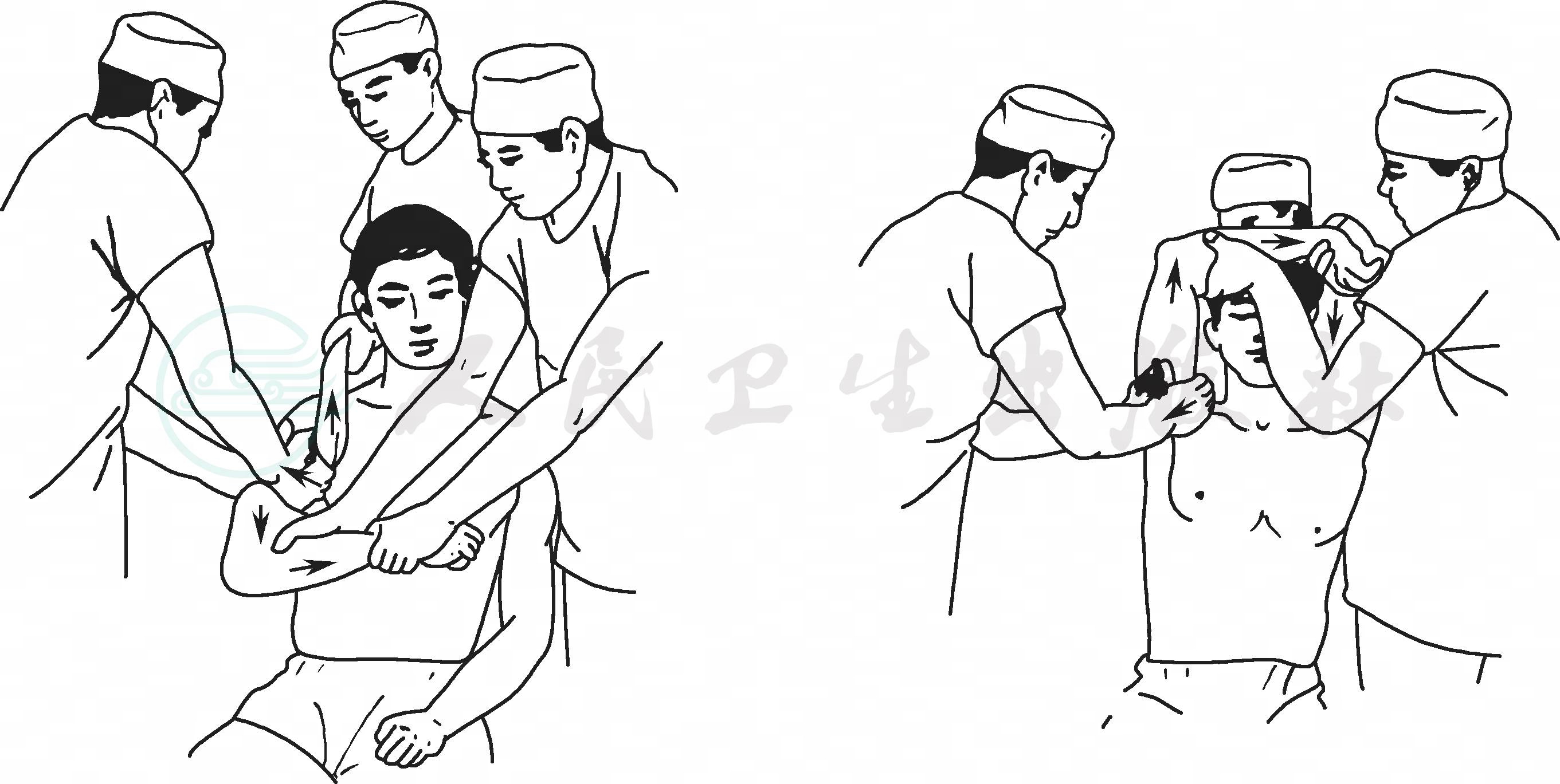 夹板固定后,注意观察患肢血运和手指活动情况,及时调整夹板松紧度。睡眠时仰卧,在肘后部垫一枕头,维持患肩关节于前屈30°位。本病后期容易引起肩关节囊的粘连,导致肩关节的活动障碍,应及早进行功能锻炼。